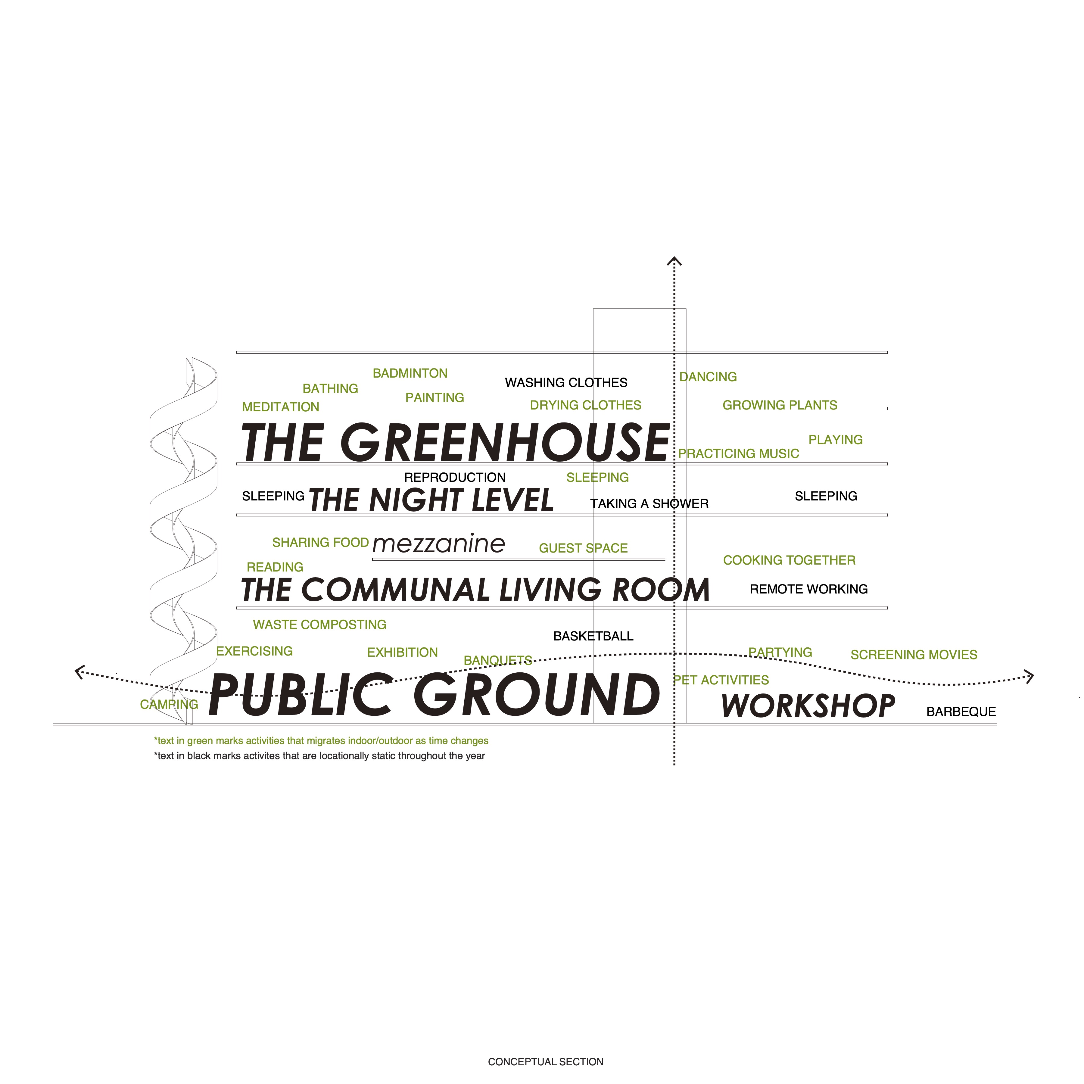 Our project, rather than a housing solution, serves as a statement and provocation that challenges the prevailing capitalist market's rigid residential housing models, in which most domestic activities happen in the private and interior. Rethinking household activities, we propose that most domestic programs can take place in a public/communal settings and seasonally outdoor (see the program diagram, with green text signifying activities that can migrate indoor/outdoor), even in cold climates like Chicago, our site. Through grouping programs that requires a similar thermal comfort and level of privacy, the project takes physical form as a generous framework, a stack of four distinct levels with an array of height, daylighting, accoustics, and thermal qualities. The goal is to minimize the privately-own spaces (the private bedrooms on level 3) but in return offer an array of shared experience on the other levels.